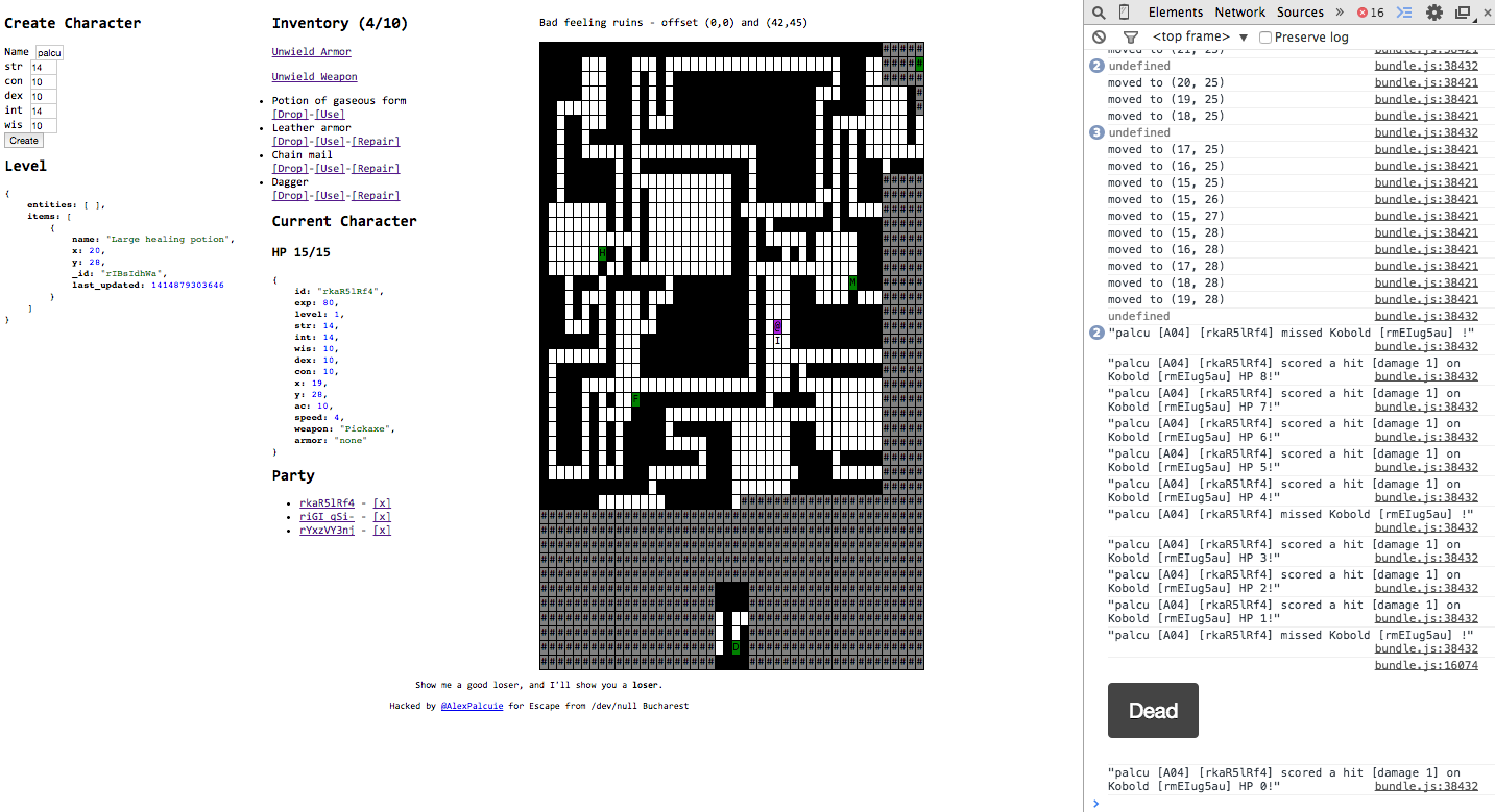 We were about 50 participants in Impact Hub Bucharest. When we arrived, we logged in the interface of the actual game.The nodes in the graph are the challenges. Till the 17th node, these were basic Computer Science or software engineering questions. From there, all the challenges involved making an algorithm that moved your character in the dungeon. I can't disclose what the actual challenges are, but you have to implement some backtracking, graph search or other fancy algorithms. In the end, I made another client in Python using the awesome Requests library, and only used my React client to see the moves of the character in the dungeon.