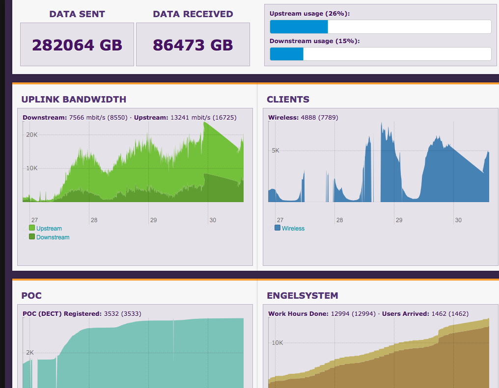 I heard somebody saying that we had more bandwidth available for the entire North Korea. Streaming every event live and keeping thousands of devices connected to the Internet is no easy achievement. Here is a screenshot from the dashboard I took on the last day:We also had our own private mobile network. I bought a SIM card, plugged it into my phone, selected from a web interface a 4 digit phone number and I could make pizza orders and talk to everybody around, thanks to Eventphone. More about the entire infrastructure in this talk: